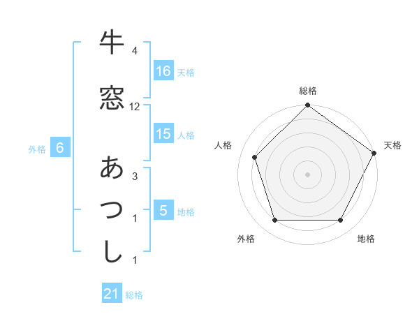 牛窓 あつしさんの総格は21画の5点!