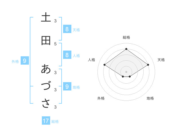 土田 あづささんの総格は17画の4点