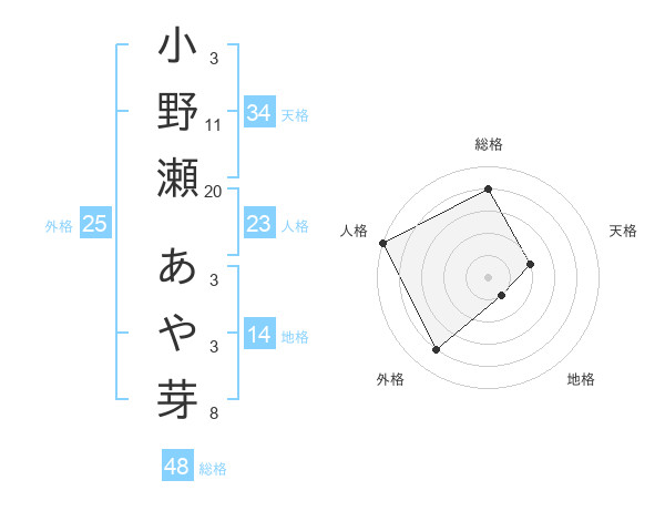 小野瀬 あや芽さんの総格は48画の4点!