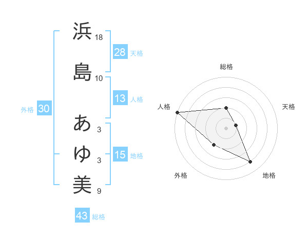 浜島 あゆ美さんの総格は43画の2点