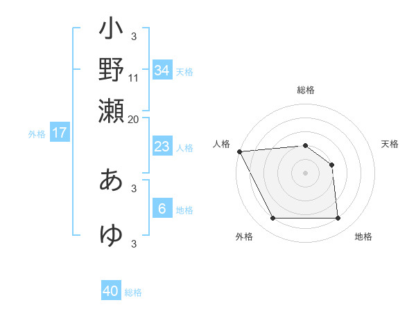 小野瀬 あゆさんの外格は17画の4点