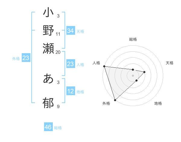 小野瀬 あ郁さんの総格は46画の1点!