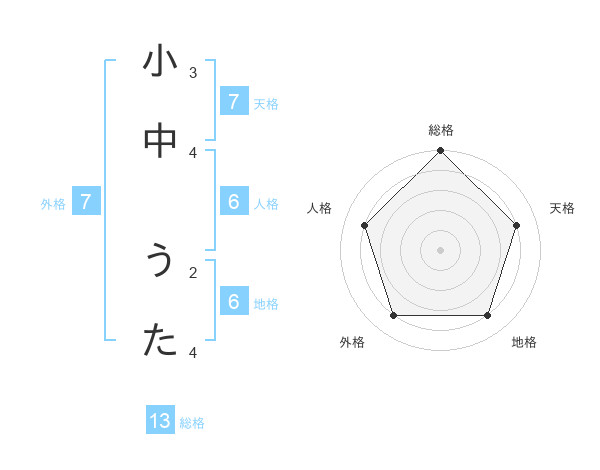 小中 うたさんの総格は13画の5点!