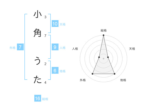 小角 うたさんの総格は16画の5点!