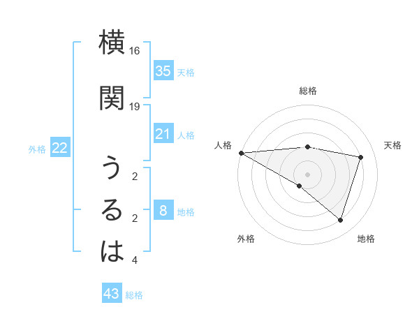 横関 うるはさんの総格は43画の2点!