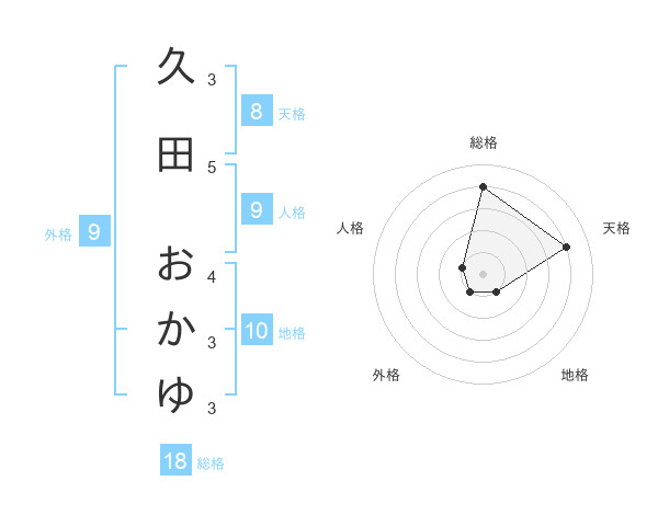 久田 おかゆさんを姓名の画数から五運を鑑定