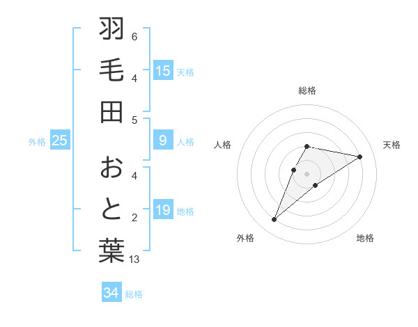 羽毛田 おと葉さんの総格は34画の2点