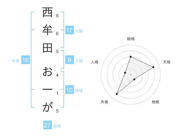 西牟田 おーがさんの天格は17画の4点!