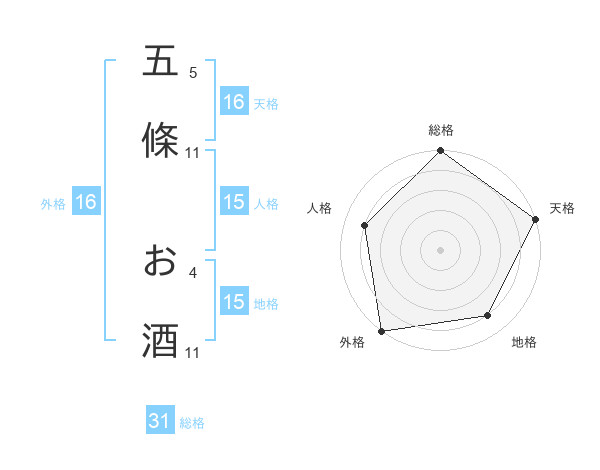 五條 お酒さんの天格は16画の5点!