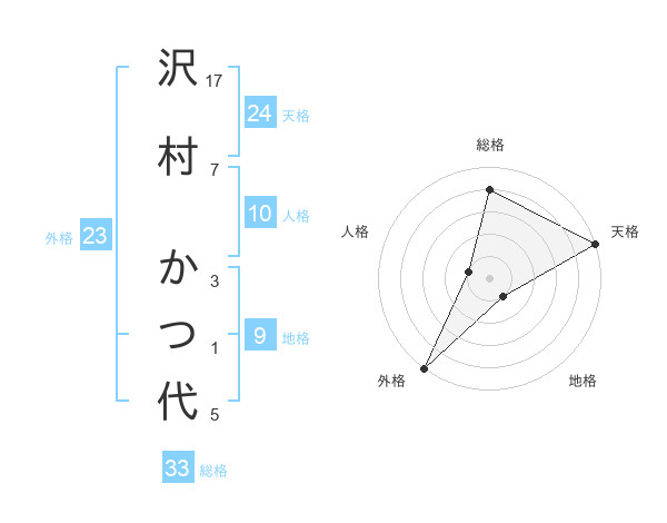 沢村 かつ代さんの総格は33画の4点!
