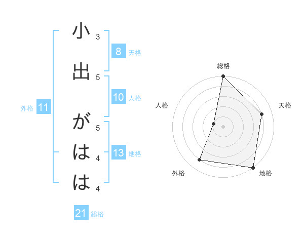 小出 がははさんの総格は21画の5点!