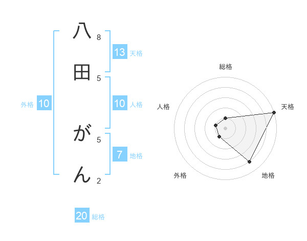 八田 がんさんの総格は20画の1点!