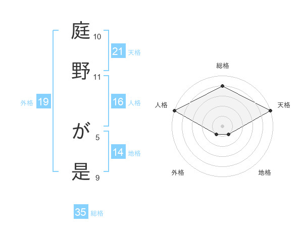 庭野 が是さんの天格は21画の5点!
