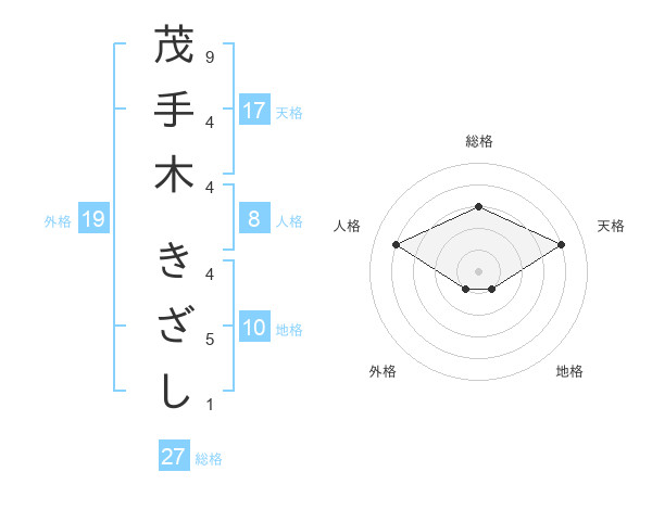 茂手木 きざしさんの総格は27画の3点!