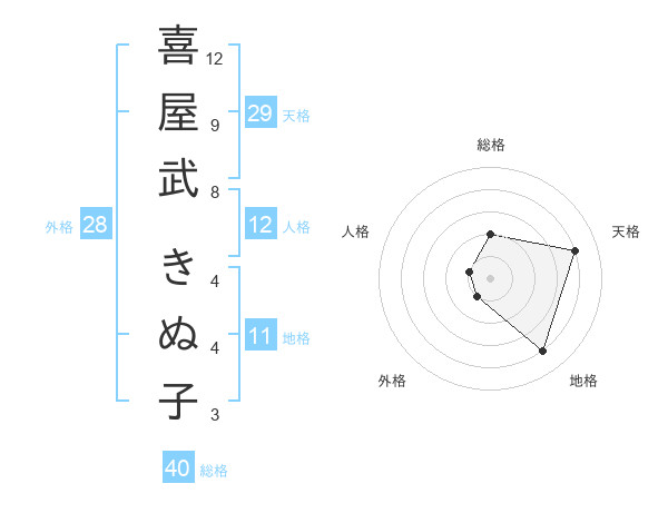 喜屋武 きぬ子さんの天格は29画の4点!