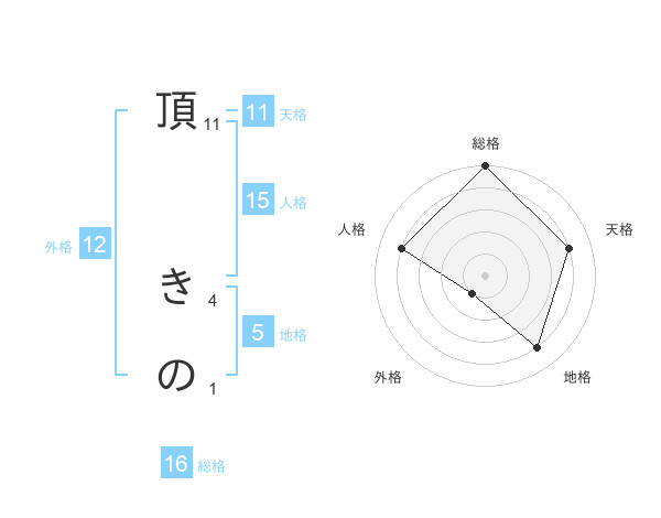 頂 きのさんの総格は16画の5点!