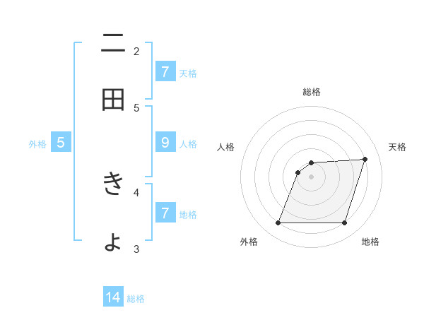 二田 きょさんの総格は14画の1点!