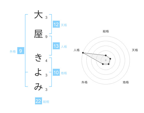 大屋 きよみさんの総格は22画の1点!