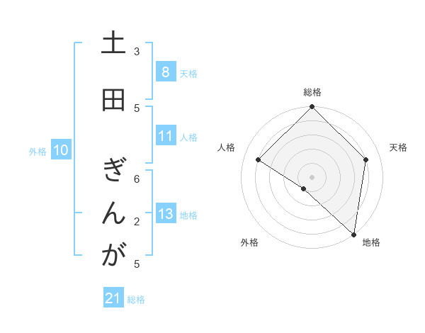 土田 ぎんがさんの総格は21画の5点!