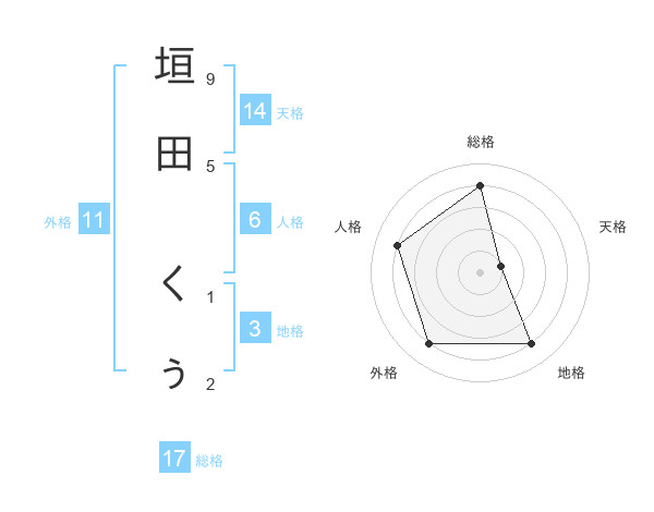 垣田 くぅさんを姓名の画数から五運を鑑定