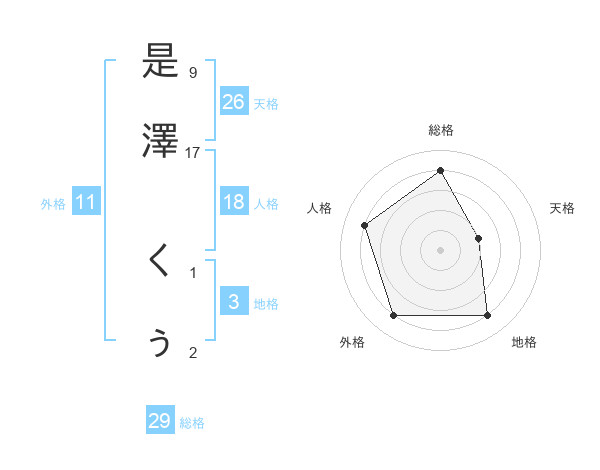 是澤 くぅさんの総格は29画の4点!