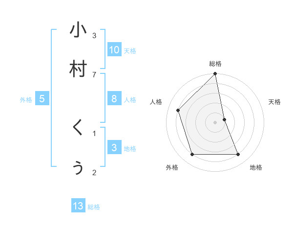 小村 くぅさんの総格は13画の5点!
