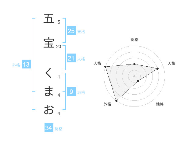 五宝 くまおさんの総格は34画の2点!