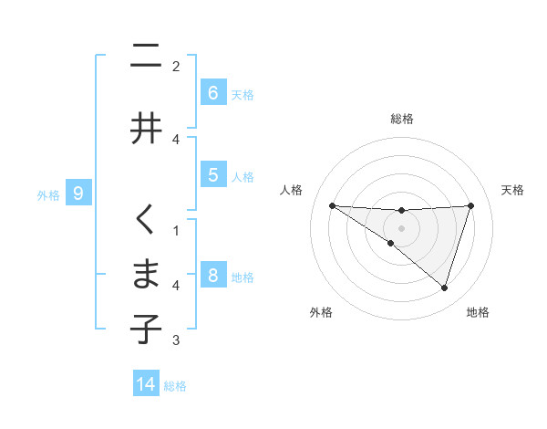 二井 くま子さんの総格は14画の1点!