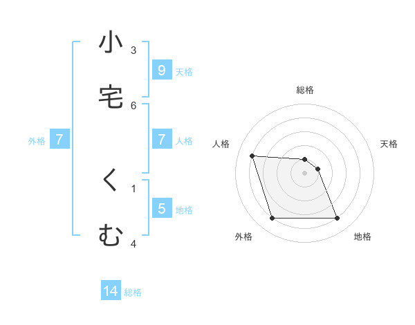 小宅 くむさんの総格は14画の1点!