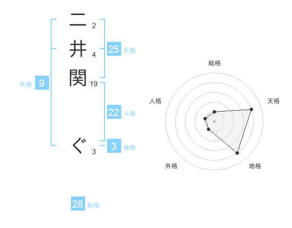 二井関 ぐさんの天格は25画の4点!