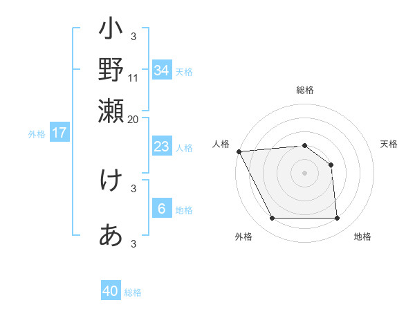 小野瀬 けあさんを姓名の画数から五運を鑑定