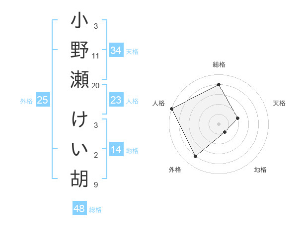 小野瀬 けい胡さんの総格は48画の4点!