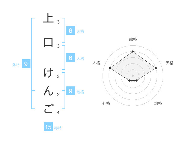 上口 けんごさんの総格は15画の4点!