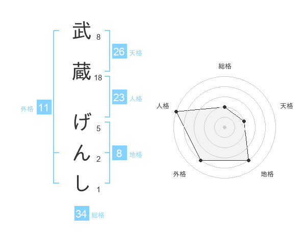 武蔵 げんしさんを姓名の画数から五運を鑑定