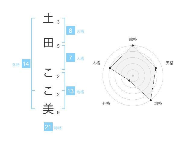 土田 ここ美さんを姓名の画数から五運を鑑定