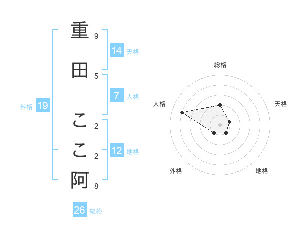 重田 ここ阿さんの総格は26画の2点!