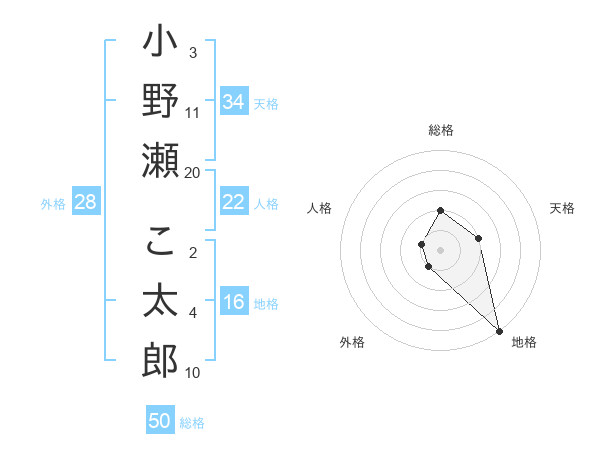 小野瀬 こ太郎さんの地格は16画の5点!