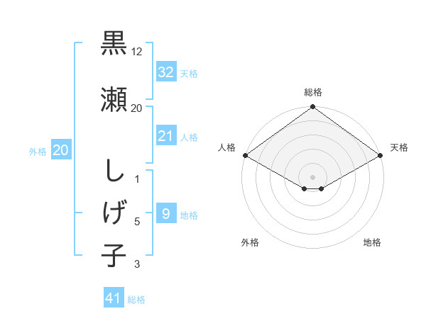 黒瀬 しげ子さんの総格は41画の5点!