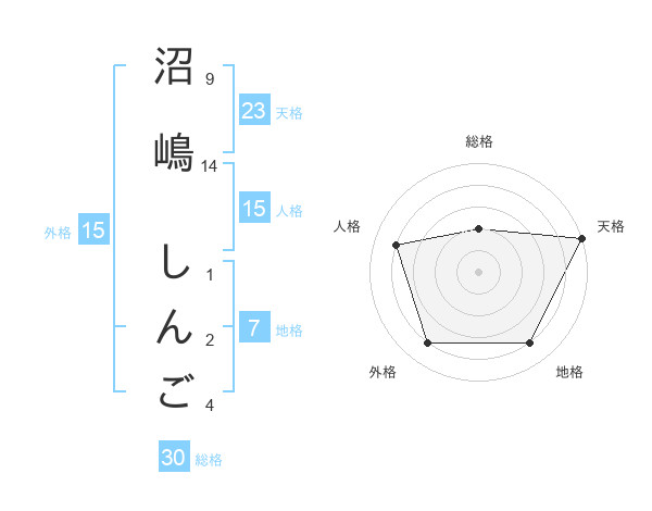 沼嶋 しんごさんの天格は23画の5点!