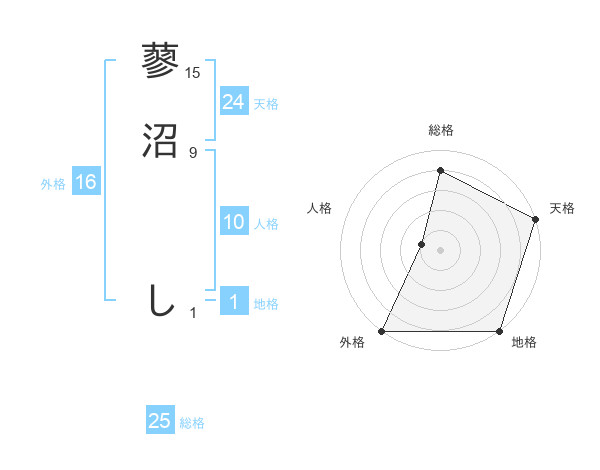 蓼沼 しさんの天格は24画の5点!