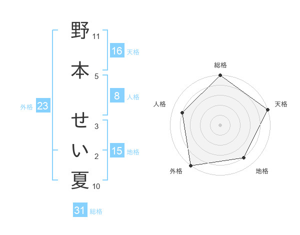 野本 せい夏さんを姓名の画数から五運を鑑定
