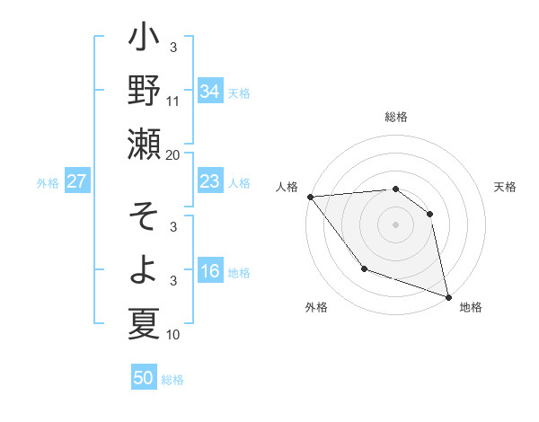 小野瀬 そよ夏さんの総格は50画の2点