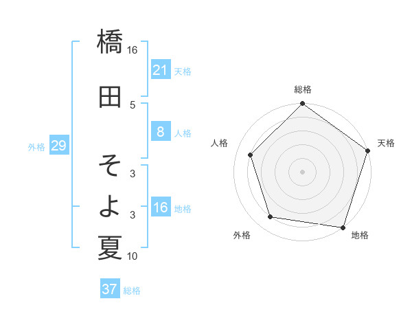 橋田 そよ夏さんを姓名の画数から五運を鑑定