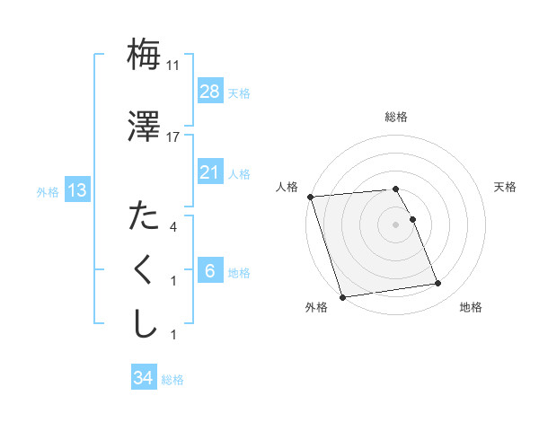 梅澤 たくしさんの外格は13画の5点!