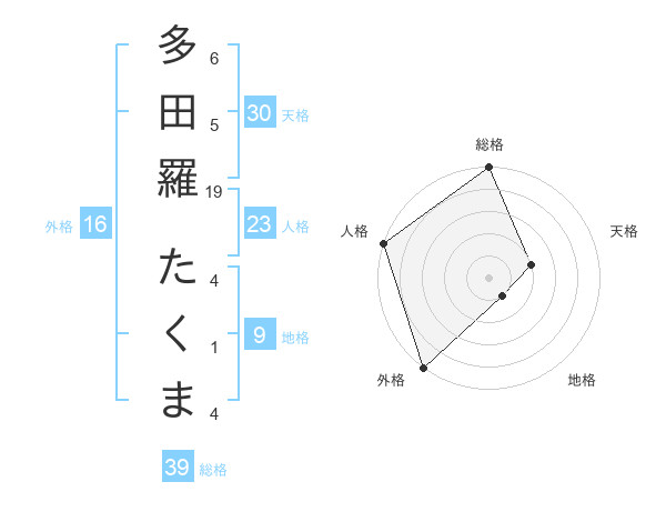 多田羅 たくまさんの外格は16画の5点!