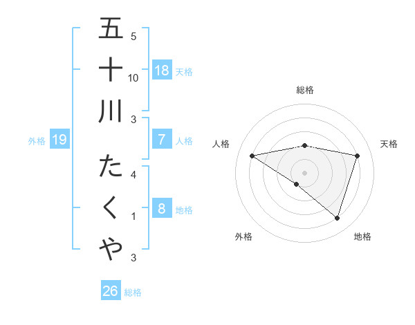 五十川 たくやさんを姓名の画数から五運を鑑定