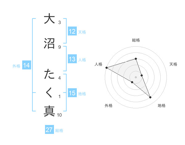 大沼 たく真さんを姓名の画数から五運を鑑定
