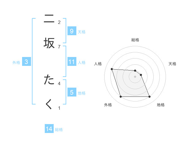 二坂 たくさんを姓名の画数から五運を鑑定