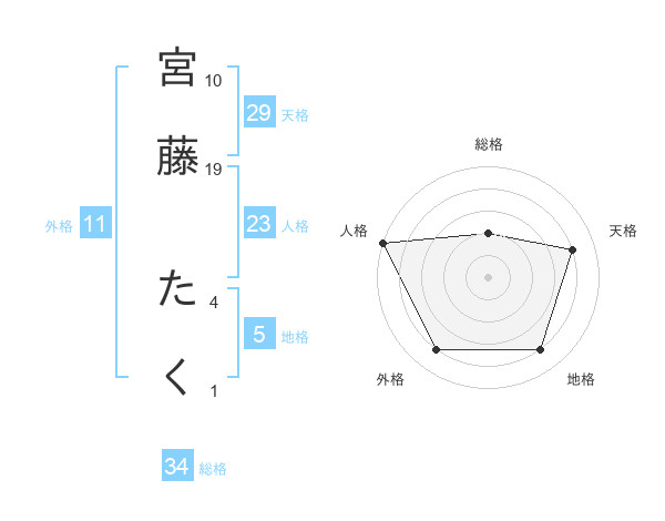 宮藤 たくさんを姓名の画数から五運を鑑定