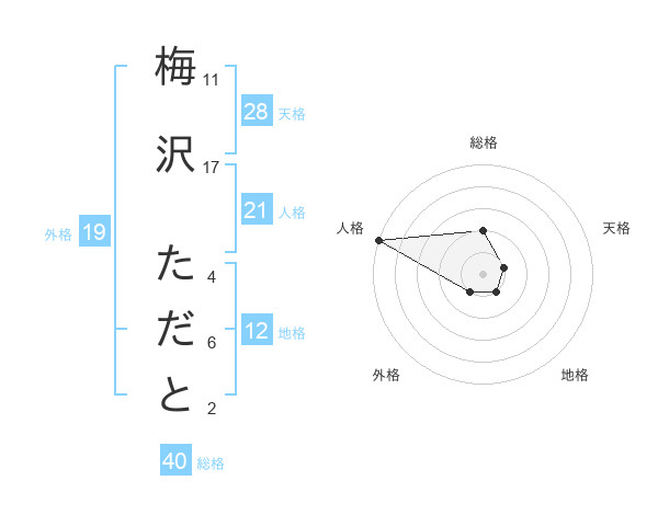 梅沢 ただとさんを姓名の画数から五運を鑑定